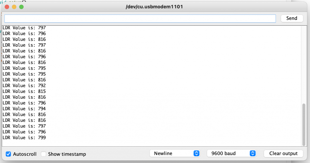ค่าความสว่างจะแสดงขึ้นที่ Serial Monitor ดังรูปประกอบ
